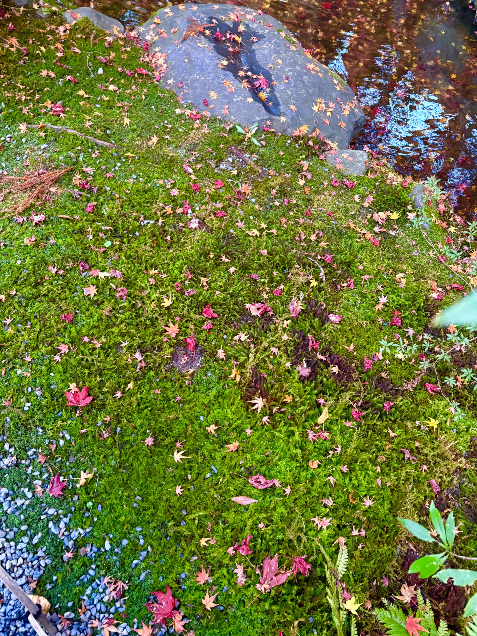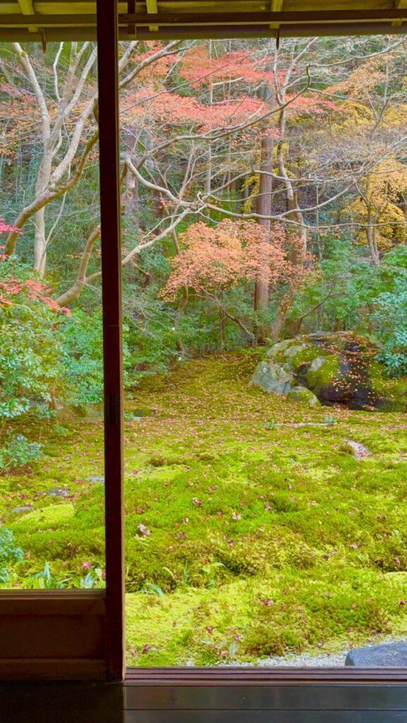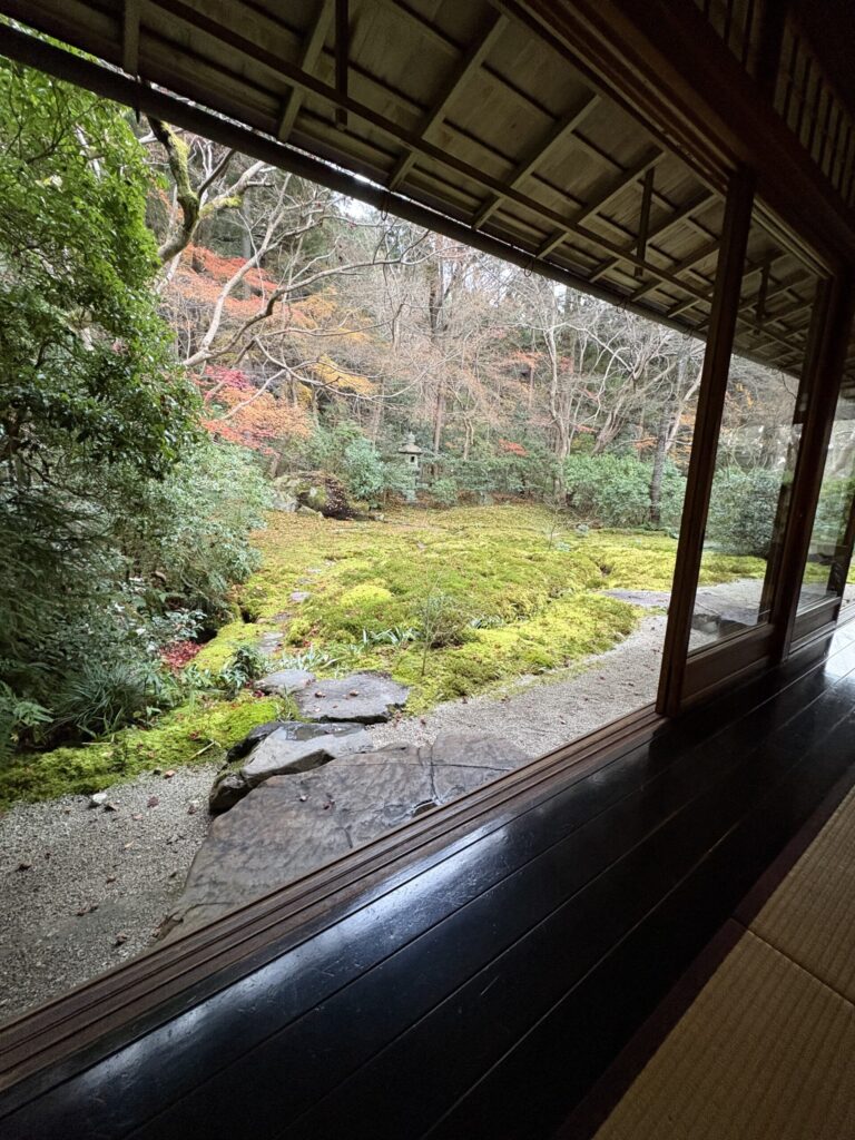 案内された順路の2階に上がると、写真で見たあの光景が広がります。鏡のように磨かれた黒漆の卓に庭の木々が映り込み、名残の秋でも十分に美しい。磨かれた廊下から庭を見下ろし、「ああ、ここが瑠璃光院なんだ」と実感します。畳の上に座り、冬の寒さを感じながら静かな時間を過ごしました。