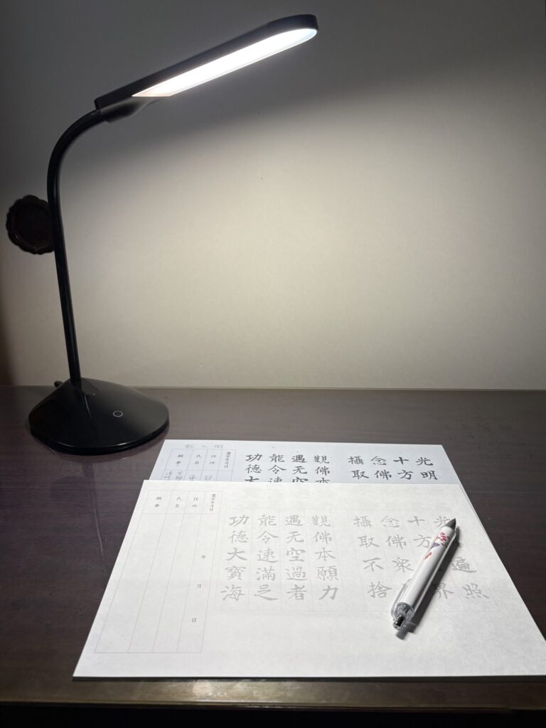 門をくぐり受付で拝観料を納め、ゆるやかなカーブを描く石段を上ります。庭の澄んだ水の池には鯉が泳ぎ、橋を渡ると写経用紙とボールペンが渡され、靴を脱いで中へ。