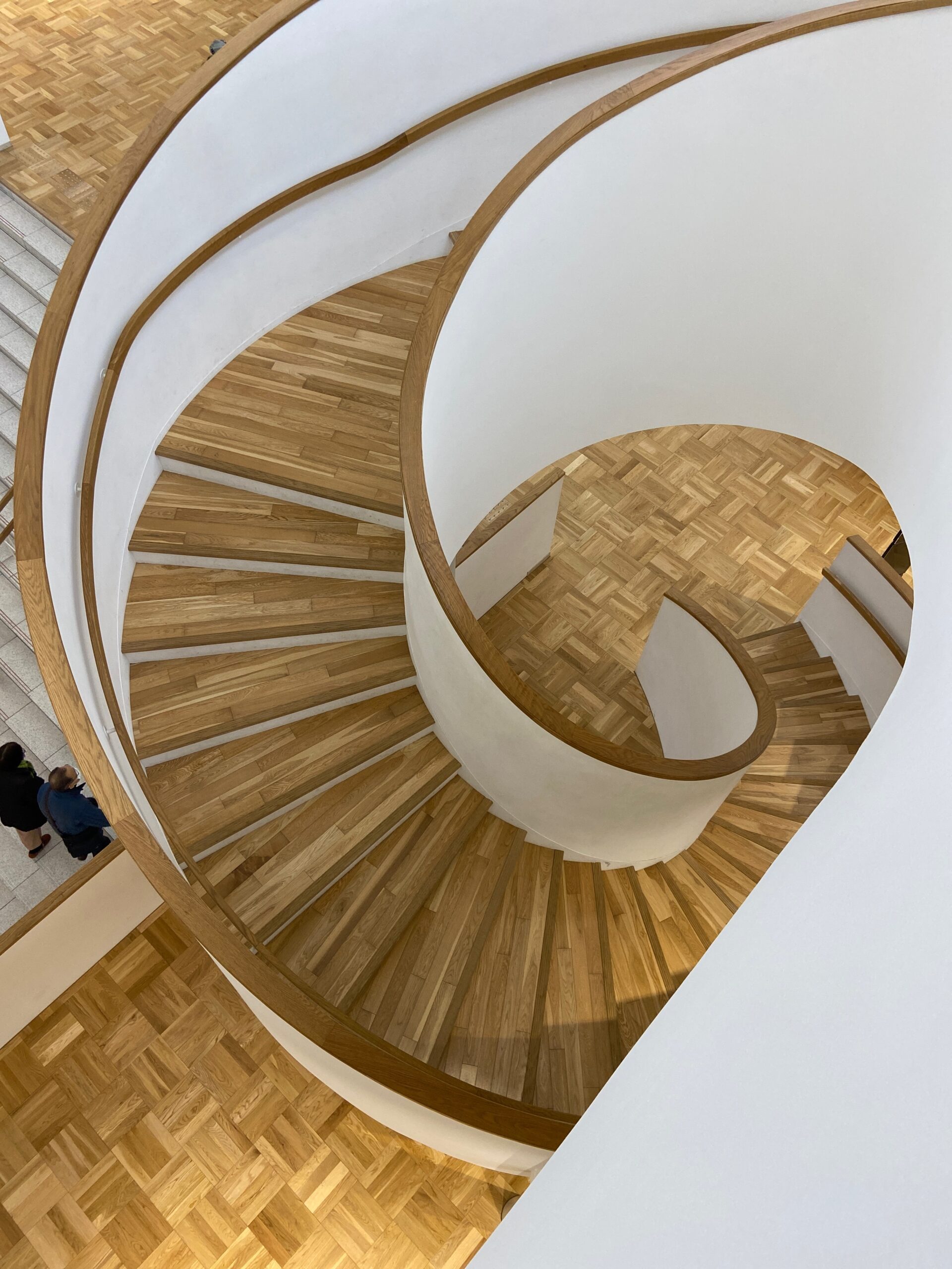 かつての大陳列室をリノベーションした中央ホール。吹き抜けの真っ白な空間に、柔らかな自然光が降り注ぎます。 ここで見逃せないのが、優雅なカーブを描く螺旋階段。流れるような美しい螺旋は、直線的な歴史建築の中に現れるこの曲線は、訪れる人を二階へと、あるいは新しい物語へと誘います。つい階段を登り、下りしてみたくなる。上へ登ると、広々とした中央ホールを見下ろす、とても気持ちのいい眺めです。